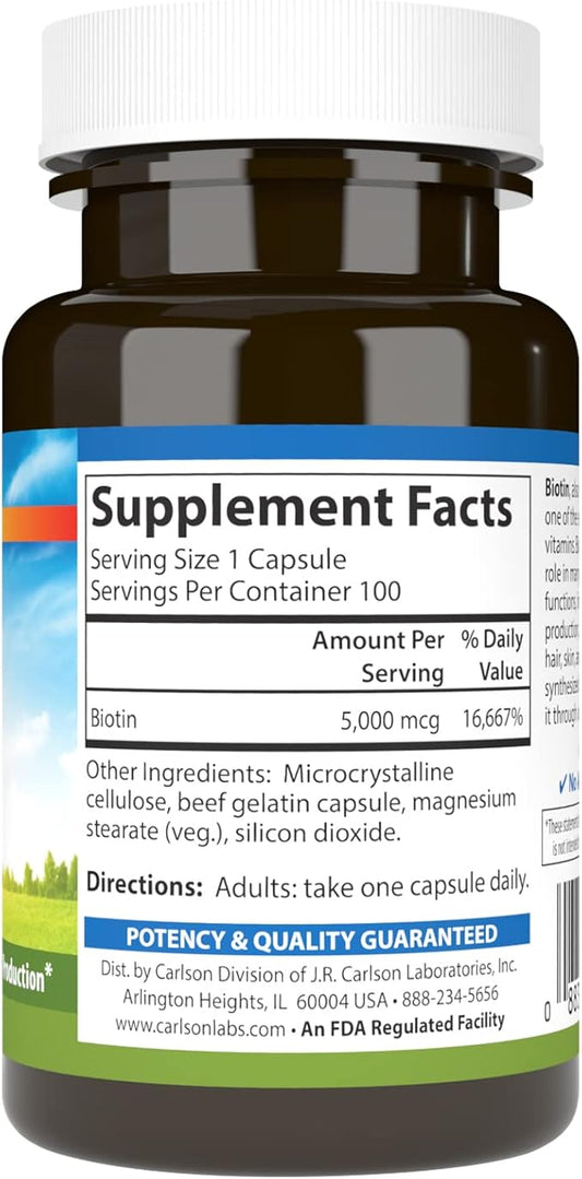 Carlson - Biotin, 5000 mcg, Healthy Hair, Strong Nails & Energy Production, 100 Capsules