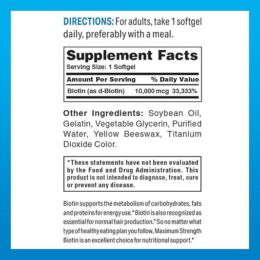 Vitamin World Ultra Mega Biotin 10,000 mcg. 50 Softgels, Vitamin B, Supports Healthy Hair, Skin and Nails, Rapid-release, Gluten Free
