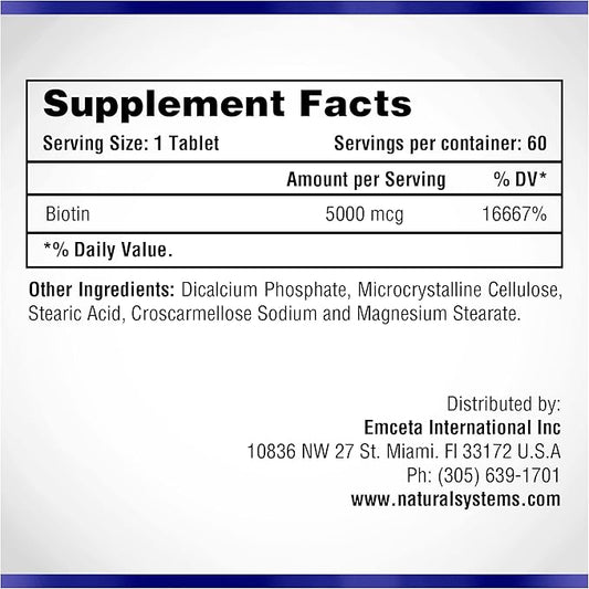 Biotin 60 Tablets 5000 mcg by Natural Systems | Biotin Hair Growth Support Pills | Hair Skin Nails Vitamins for Men and Women | Biotin Supplement Improves Cell Growth