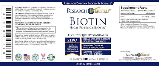 Research Verified Biotin – Pure Biotin Extra Strength 10,000mcg for Improved Hair, Skin and Nail Health - 360 Vegan Tablets