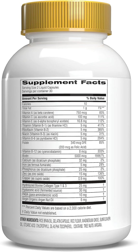 Botanic Choice Hair Skin and Nails Vitamins - Biotin Supplement with Collagen, Vitamin C, & Iron - Super Antioxidant Blend with Argan Oil & Hyaluronic Acid - 60 Liquid Capsules