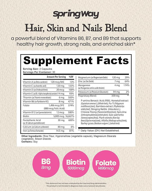 Hair Skin & Nails Blend, Ultimate Hair Nutraceutical With Biotin 5000mcg, Vitamins A, B6, C, D, Supports Healthy Hair, Supports Faster Hair Growth, Healthy Skin, Stronger Nails, 60 Capsules