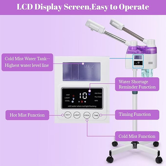 Professional 2 in 1 Ozone Facial Steamer on Wheels - Hot & Cold with Time Setting, Adjustable Height for Spa, Salon & Home