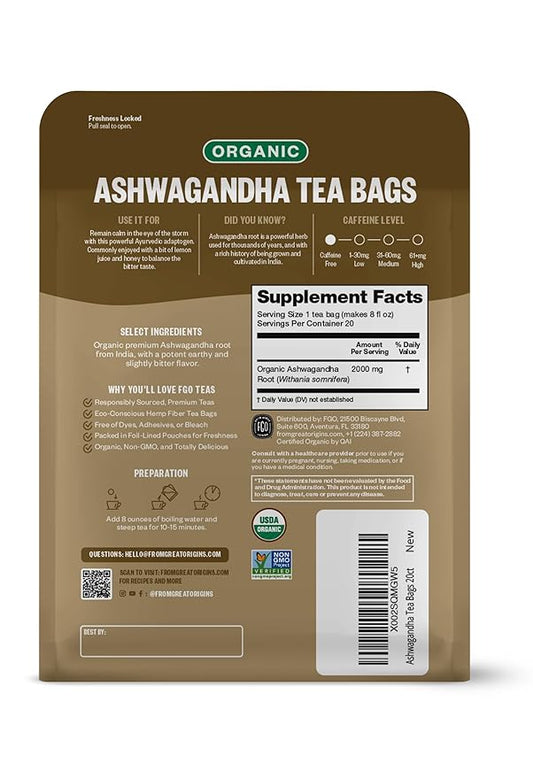 FGO Organic Ashwagandha Tea, 20 Count, Eco-Conscious Herbal Tea Bags, Resealable Bag, Caffeine Free, Packaging May Vary (Pack of 1)