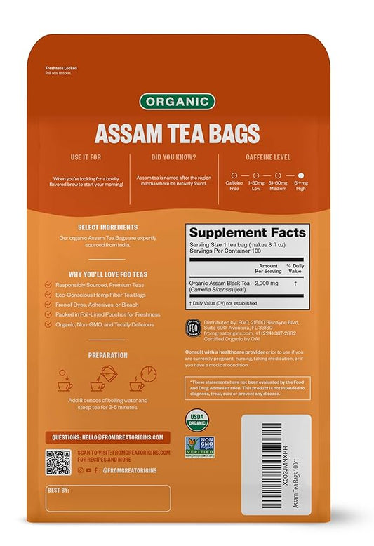 FGO Organic Assam Tea, 100 Count, Eco-Conscious Black Tea Bags, Resealable Bag, Packaging May Vary (Pack of 1)