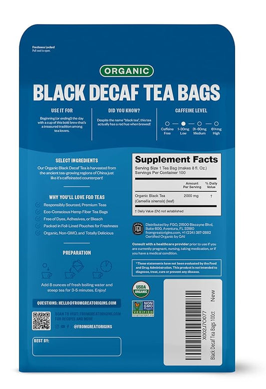 FGO Organic Black Decaf Tea, 100 Count, Eco-Conscious Tea Bags, Resealable Bag, Packaging May Vary (Pack of 1)