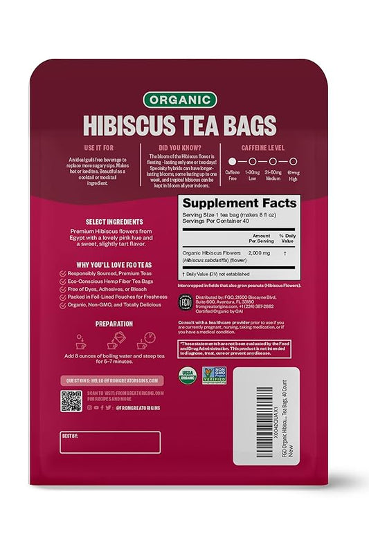 FGO Organic Hibiscus Herbal Tea, 40 Count, Eco-Conscious Tea Bags, Caffeine Free (Pack of 1)