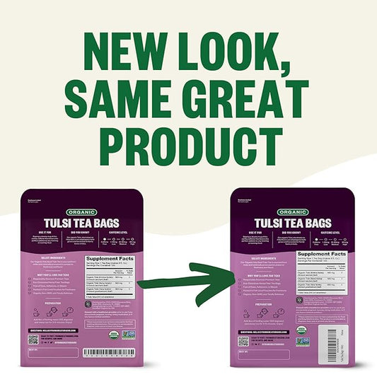 FGO Organic Tulsi Holy Basil Tea, 100 Count, Eco-Conscious Herbal Tea Bags, Resealable Bag, Caffeine Free, Packaging May Vary (Pack of 1)