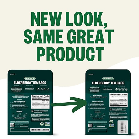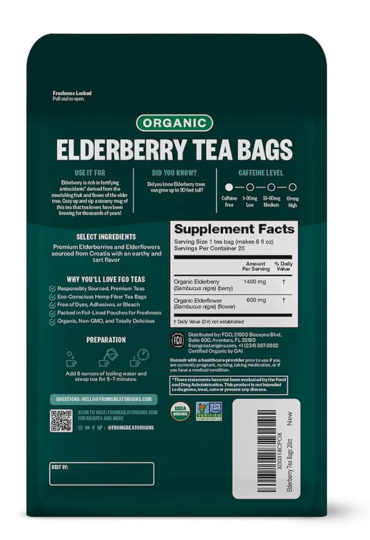 FGO Organic Elderberry Tea, 20 Count, Eco-Conscious Herbal Tea Bags, Resealable Bag, Caffeine Free, Packaging May Vary (Pack of 1)
