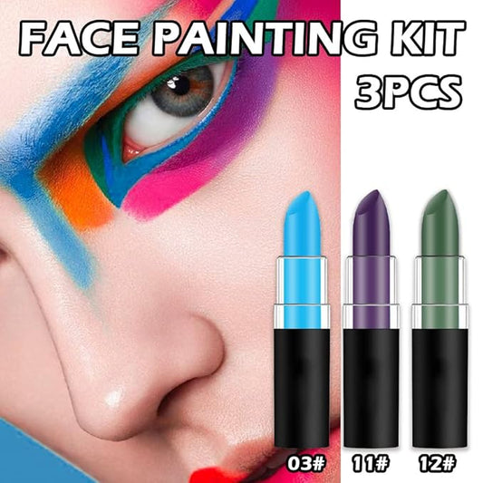 Kaely 3Pcs Face Paint Stick,Pro Eye Black Stick Baseball Football Softball,Easy to Color,Blue Green Purple Matte Lipstick Face Body Paint Set,Halloween Birthday Party Clown Makeup Sets