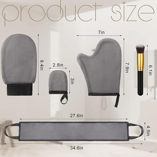 5 Pieces Self Tanning Mitt Applicator Kit, Includes Exfoliating Glove, Tanning Mitt, Mini Face Mitt, Back Lotion Applicator with Self Tanner Brush Large Flat Top Makeup Brush (Gray)