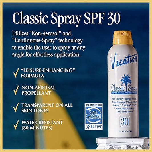 Vacation Classic Spray Sunscreen SPF 30 3-Pack, Broad Spectrum Sunscreen Spray, Vegan Sunblock Spray, Body Lotion with SPF, Spray Sunscreen SPF 30, 6 fl. oz. (Pack of 3)