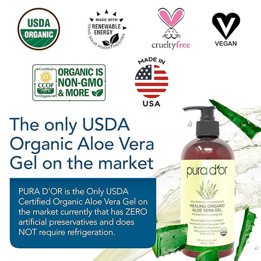 PURA D'OR 16 Oz ORGANIC Aloe Vera Gel - Lemongrass - All Natural - ZERO Artificial Preservatives - Deeply Hydrating & Moisturizing - Sunburn, Bug Bites, Rashes, Small Cuts, Eczema Relief - Skin & Hair