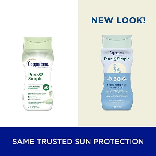 Coppertone Pure and Simple Zinc Oxide Mineral Sunscreen Lotion SPF 50, Body Sunscreen, Water Resistant, Broad Spectrum SPF 50 Sunscreen for Sensitive Skin, 6 Fl Oz Bottle