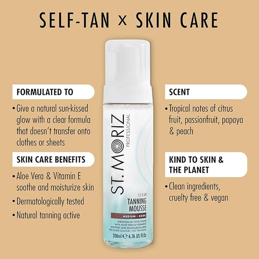 St Moriz Professional Clear Tanning Mousse with Aloe Vera & Vitamin E, Fast Drying Vegan Fake Tan, Medium to Dark (200ml)