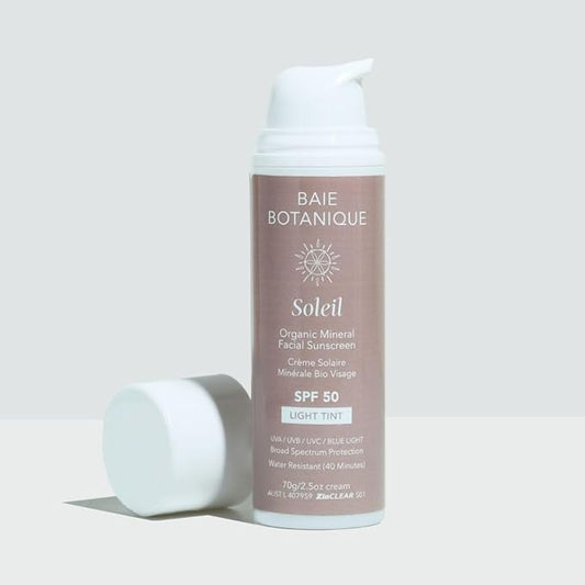 NEW SIZE - Baie Botanique Soleil Organic Facial Sunscreen SPF 50 - Chemical Filter Free Hyaluronic Acid & Vitamin C Sunscreen for Face Natural Vegan No White Cast Non Toxic UVA/UVB - Light Tint 70g