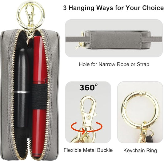 Bocasal Leather Lipstick Case Holder Chapstick Keychain Pouch, Zipper Lip Balm Lip Gloss Bag for Purse with Key Chain Elastic Band, Makeup Travel Organizer, Cosmetic Storage Kit for Women Girls (Grey)