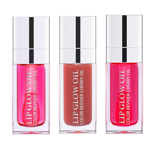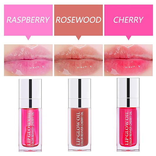 Plumping Lip Oil(3 Pcs), Hydrating Lip Gloss Tinted Lip Balm Transparent Lip Care, Big Brush Head Glitter Shine, Long Lasting Nourishing Non-sticky Fresh Texture, Cherry+Rosewood+Raspberry