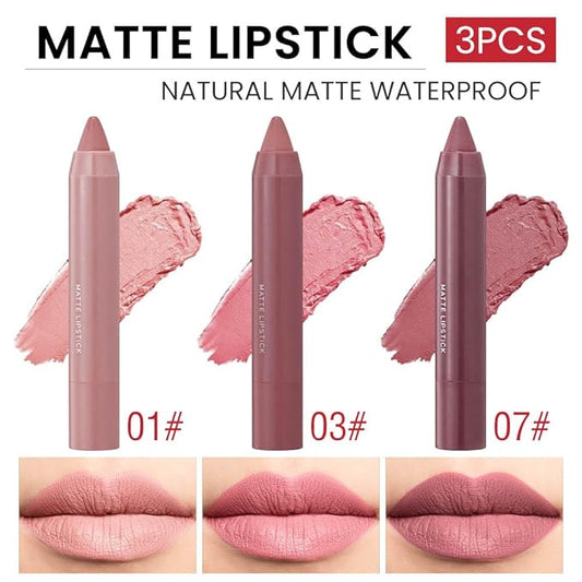 3 Colors Matt Nude Lipstick Lipliner Lip Crayons Pack Set,Velvet Moisture Smooth Matte Lipstick Pencils,Waterproof&Waterlasting,#01#03#07