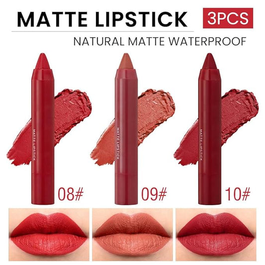 3 Colors Matt Nude Lipstick Lipliner Lip Crayons Pack Set,Velvet Moisture Smooth Matte Lipstick Pencils,Waterproof&Waterlasting,#08#09#10