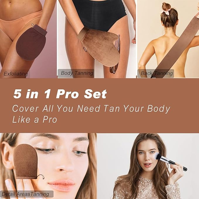 • 【5-in-1 Luxury Pro Self Tanning Mitt】You deserve the BEST! Treat yourself to the BEST self tanning mitt applicator, get a real flawlessly sun-kissed skin, and finish by yourself without asking others for help. This self tan mitt set includes 1x tanning glove, 1x back applicator, 1x tanning brush for face tan, 1x mini mitt for detail tan(such as fingers and toes, etc), 1x exfoliating mitt, which ensure you use self tanning mitt separately for each part of the body, MORE clean and safe.
