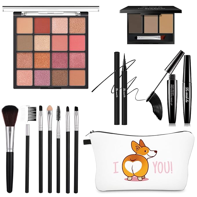 • 💄ALL IN ONE MAKEUP KIT FOR GIRLS - This makeup kits for women contains: 1 x 16 colors purple tone eyeshadow palette, 1 x waterproof and smudge-shield mascara, 1 x waterproof and smooth liquid eyeliner, 1 x tri-color eyebrow powder, 1 x corgi waterproof material cosmetic bag, 1 x 7pcs Soft Makeup Brush Set. The simple make up set is perfect for makeup artists or starters and beginners achieving a full-face flawless, natural and nude eye makeup effects.