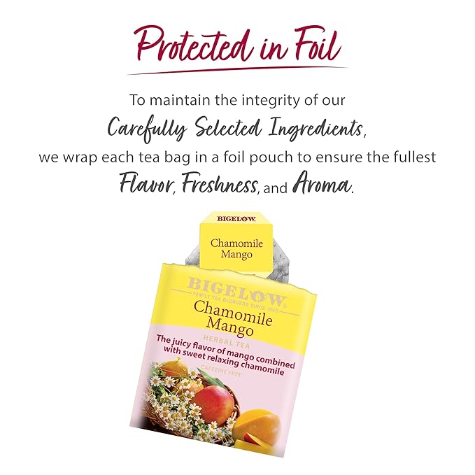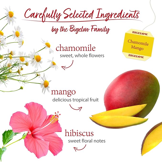 • Tropical Chamomile Mango: 120 tea bags of Bigelow Chamomile Mango Herbal Tea, a sweet and relaxing tea for a tropical experience right in your cup