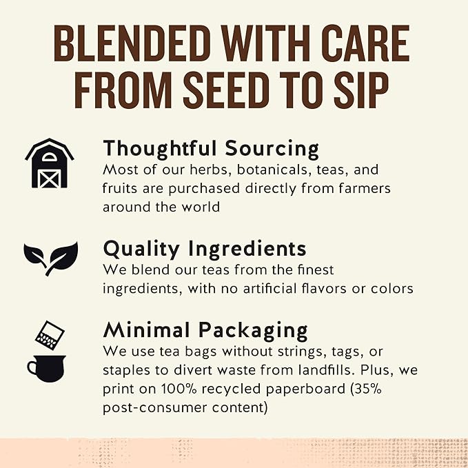• MINIMAL PACKAGING: We use tea bags without strings, tags, or staples to divert waste from landfills. Plus, we print on 100% recycled paperboard (35% post-consumer content)