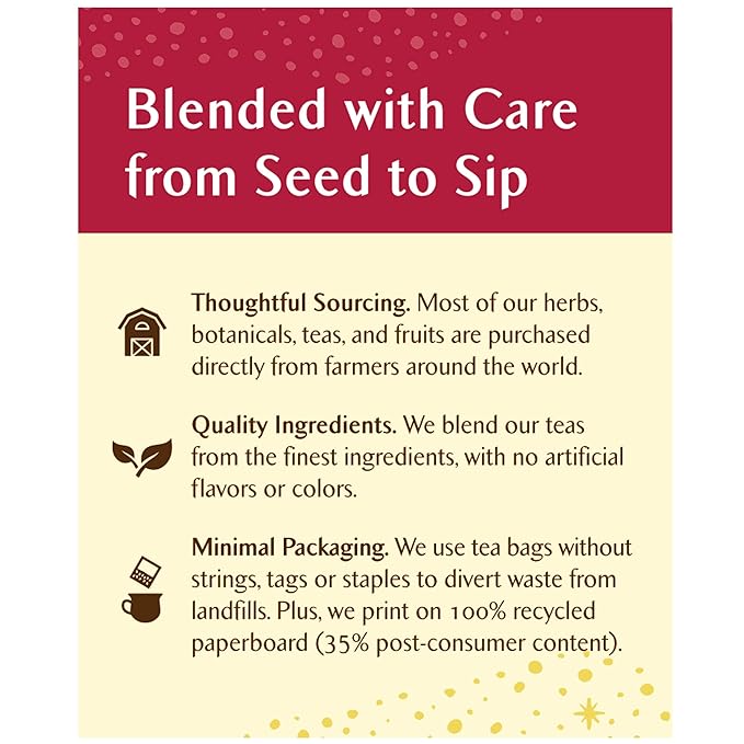 • Responsible packaging: recycled boxes; stringless tea bags help reduce waste