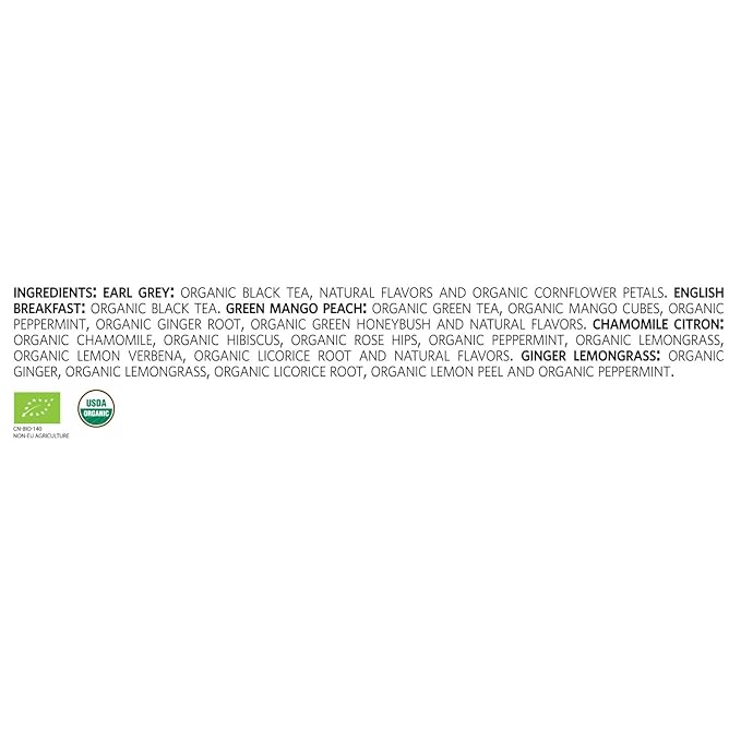 • ORGANIC TEA SAMPLER with an assortment of our most popular USDA Organic tea blends - Earl Grey, English Breakfast, Chamomile Citron, Green Mango Peach & Ginger Lemongrass.