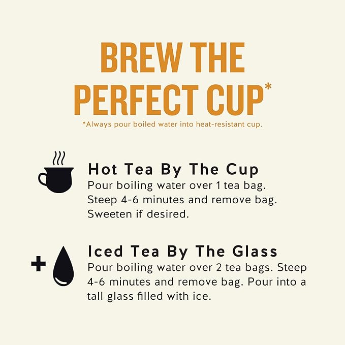 • Your Perfect Cup: Steep the tea bag in hot water for 4-6 minutes and remove the bag for comforting hot tea. Use the same process over 2 tea bags and serve over ice for a refreshing glass of iced tea.