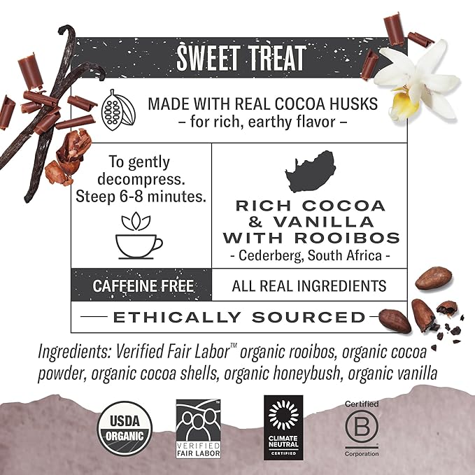 • Smooth South African rooibos is enveloped by creamy real vanilla beans, sweet honeybush and rich cacao