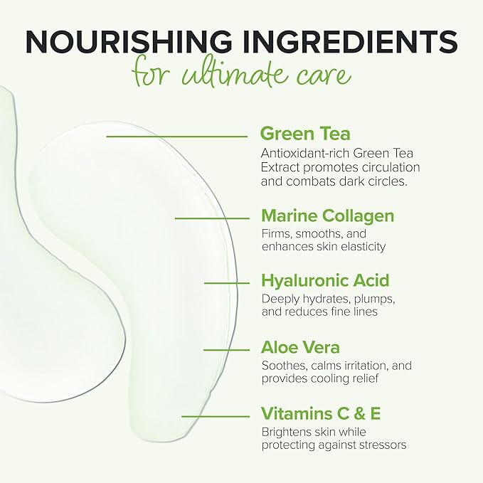 • NUTRIENT PACKED. Green Tea EYES collagen gel masks are micro-infused with a combination of hyaluronic acid, natural high-density marine collagen, enzymes, amino acids, natural marine minerals, trace elements, proteins and vitamins C & E.