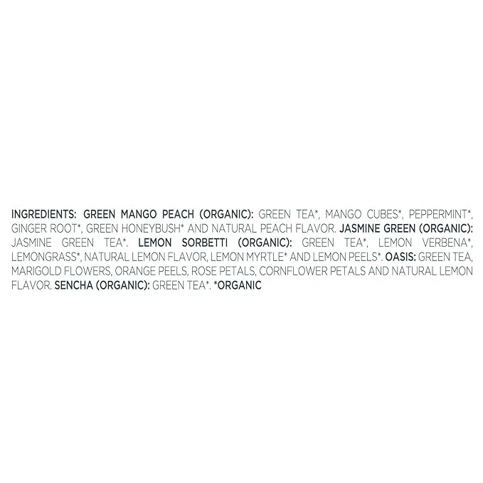 • GREEN TEA ASSORTMENT with the finest quality green tea leaves, blended with fruits, flowers and herbs: Green Mango Peach, Jasmine green, Lemon Sorbetti, Oasis and Sencha.