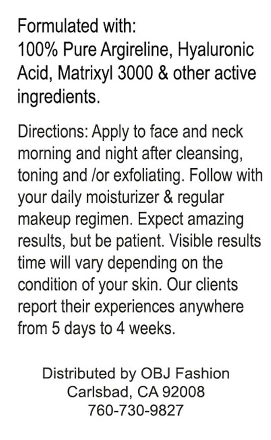 • Before and after pictures of women & celebrities who used the same ingredients: Argireline w/ Hyalurnoic Acid and Matrixyl 3000 Serum, and the results were really impressive. You will almost immediately see a change in your skin and an increase in your skin’s radiance.