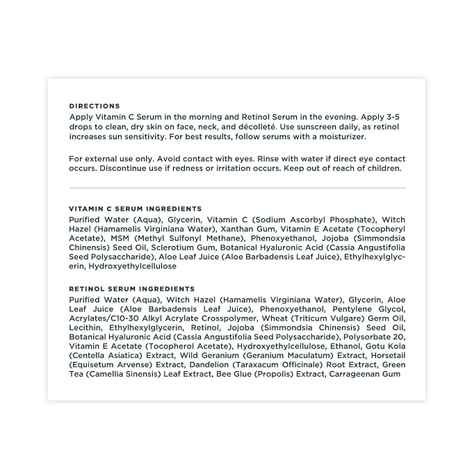 • EASY TO USE DIRECTIONS: Apply Niacinamide Serum in the morning followed by Vitamin C Serum. Apply Niacinamide Serum in the evening followed by Retinol Serum, then Hyaluronic Acid Serum. Apply 3-5 drops to clean, dry skin on face, neck, and décolleté. Use sunscreen daily, as retinol increases sun sensitivity. For best results, follow serums with a moisturizer
