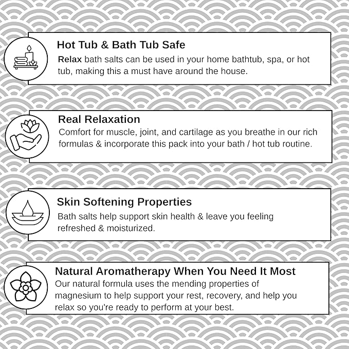 • MADE IN THE USA WITH MINERAL-RICH SALTS: Relax Spa & Bath, proudly crafted in the USA, our epsom salts and Dead Sea salt for soaking contain up to 10 times more minerals than regular bath salts, offering nourishment and revitalization for your skin.