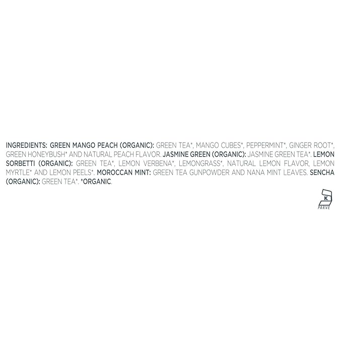 • ORGANIC GREEN TEA SAMPLER with five varieties of the world's finest green tea blends - Green Mango Peach, Jasmine Green, Moroccan Mint, Lemon Sorbetti, Sencha.