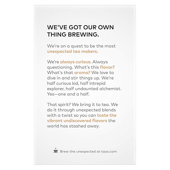 • CONVENIENT & VERSATILE: Enjoy the TAZO hot or cold tea bags as a delicous treat any time of the day; TAZO tea bags are caffeine free and best enjoyed hot or iced