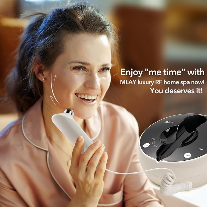 • Spa Vibes in Your House: Skip pricey salon appointments! The MLAY radio frequency machine features 3 energy levels + 3 timer settings for effortless use. This table model device lives on your vanity—use it during everning while watching tv. Enjoy a warm, relaxing massage that melts stress while rejuvenating-skin—perfect for bedtime self-care rituals. Results in firmer facial-contours, and minimized crow's feet within 8-12 weeks. Pro tip: Apply your favorite serum after the treatment!