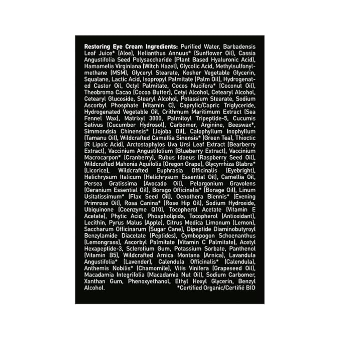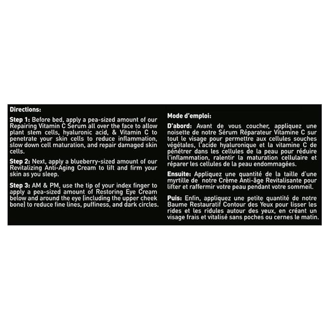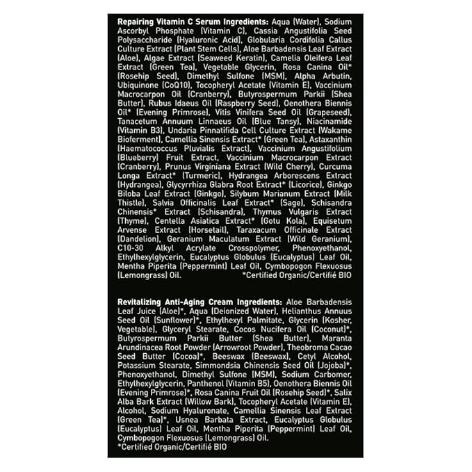 • Key Ingredients: Natural & Certified Organic ingredients, including aloe, DMAE, MSM, Plant Stem Cells, Vitamin C, hyaluronic acid, protein peptides, and caffeine.