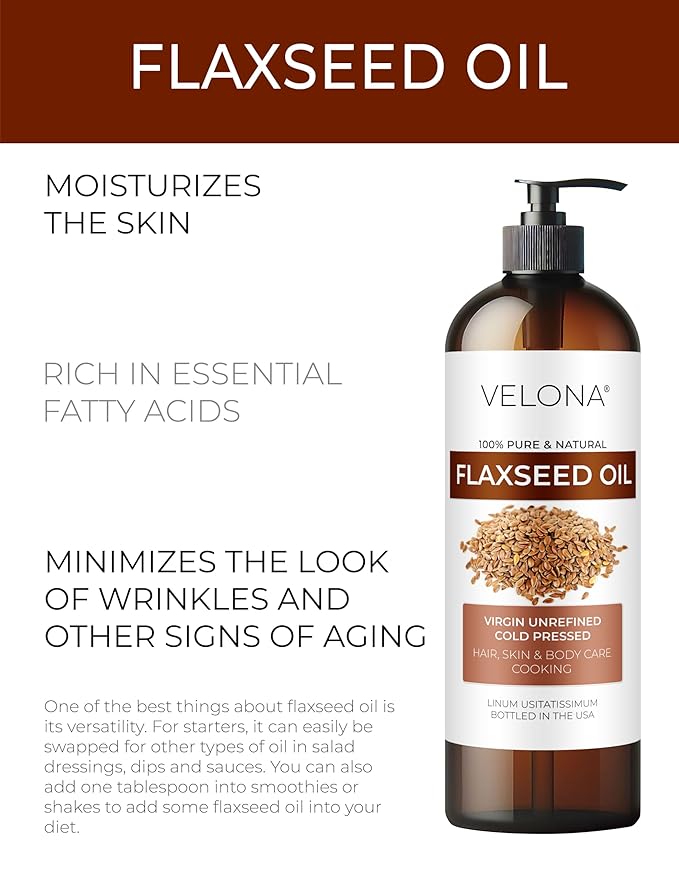 • Velona Flaxseed Oil: 100% Pure and Natural Carrier Oil. Unrefined. Cold Pressed. Not Diluted, Non-GMO, No Additives, No Fragrance, Chemical Free, Alcohol Free.