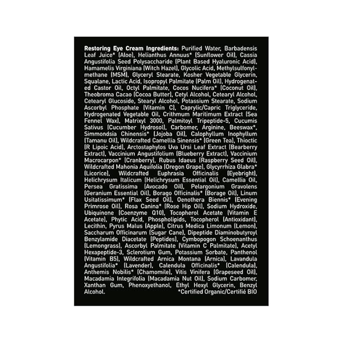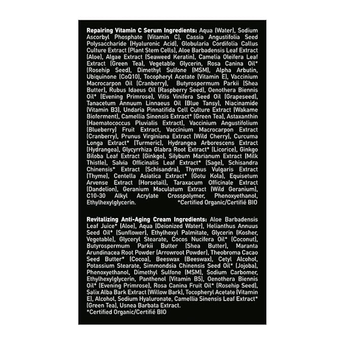 • Key Ingredients: Natural & Certified Organic ingredients, including aloe, DMAE, MSM, Plant Stem Cells, Vitamin C, hyaluronic acid, protein peptides, and caffeine.