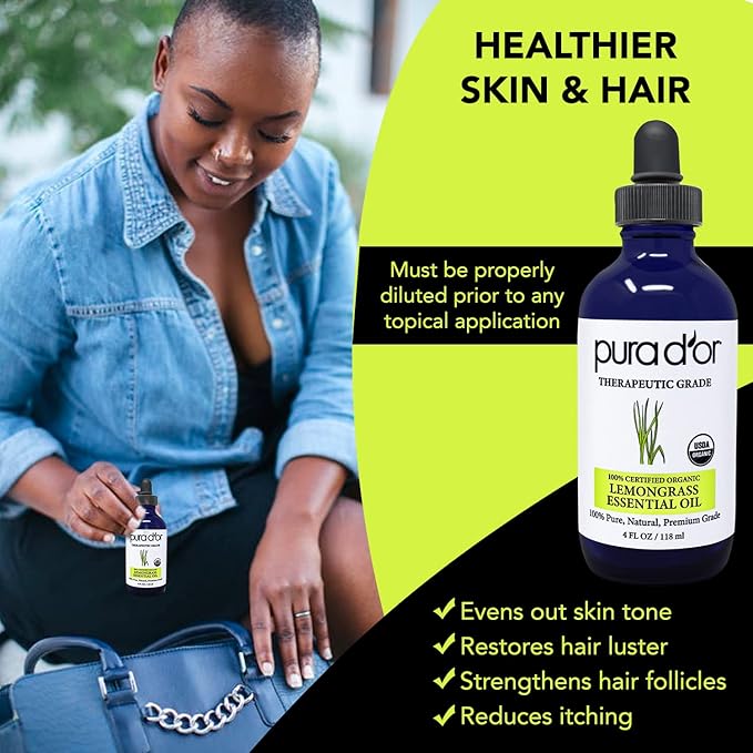 PURA D'OR Organic Lemongrass Essential Oil, 4oz, Therapeutic Grade, for Hair, Body, Skin, Aromatherapy, Relaxation, Massage, Vitality, Home, DIY Soap
