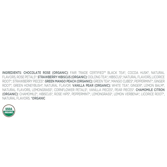 • SOPHISTICATED COLLECTION includes five organic tea blends, 2 infusers of each blend: Chamomile Citron (Herbal), Chocolate Rose (Black), Green Mango Peach (Green), Strawberry Hibiscus (Oolong), and Vanilla Pear (White)