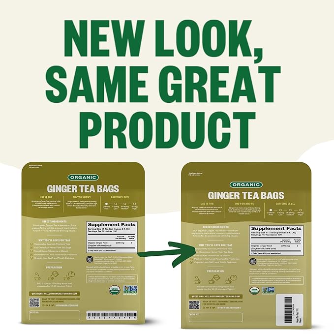 • ORGANIC GINGER TEA - The tea is filled into tea bags and packed into foil-lined kraft bags in California