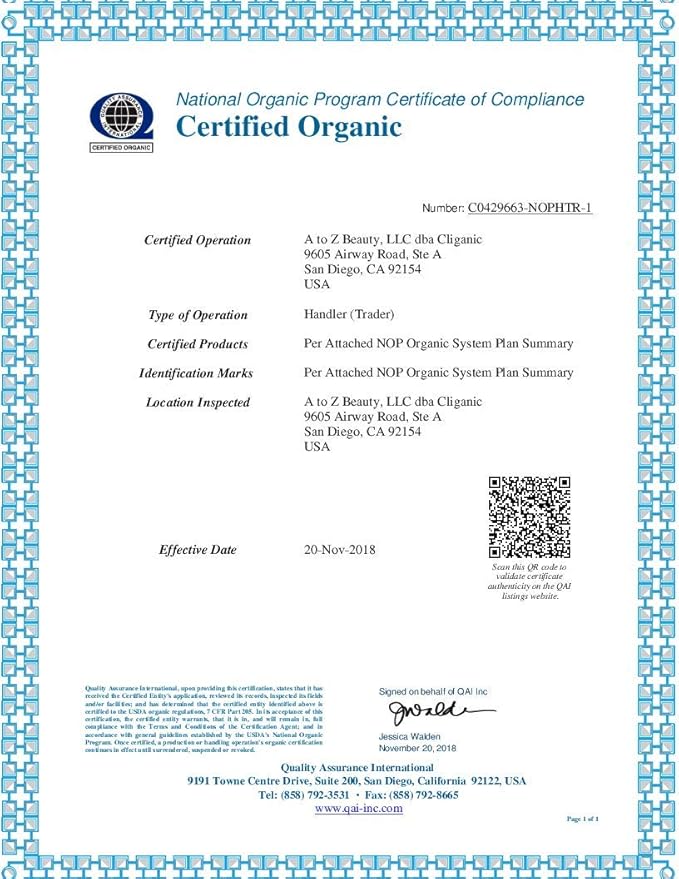 • Certified Organic Jojoba Oil - Cliganic organic jojoba oil is proudly USDA organic certified to ensure ultimate quality and integrity.
