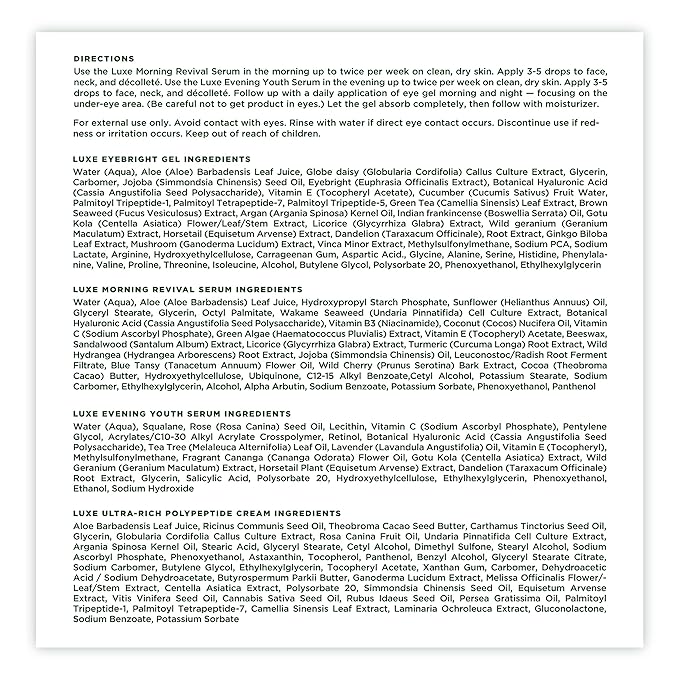 • Your total skin transformation awaits. The Luxe Eyebright Gel targets dark circles, puffiness, and crow’s feet. Luxe Morning Revival Serum awakens skin with brightening and smoothing properties. Luxe Evening Youth Serum helps combat fine lines and deeply hydrate the skin. Luxe Ultra-Rich Polypeptide Cream penetrates deep to plump and nourish.