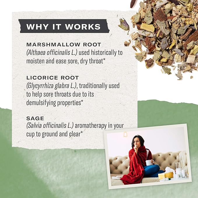 • Organic Throat Relief Tea: Our Throat Soother herbal tea blends sage, licorice root, marshmallow root, cinnamon and clove for a comforting cold and flu season tea; Delicious with honey and lemon