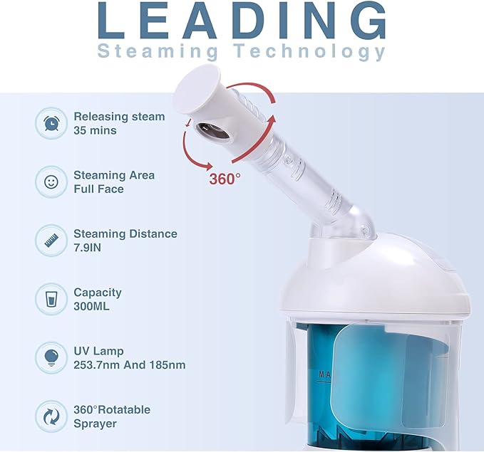 • 【360° Rotatable Sprayer】: The steam pipe can be rotated at any angle of 360°, you can lie down, stand and sit down to enjoy the perfect facial SPA. Please keep your face at least 7.9 inches away from the nozzle to avoid burns.
